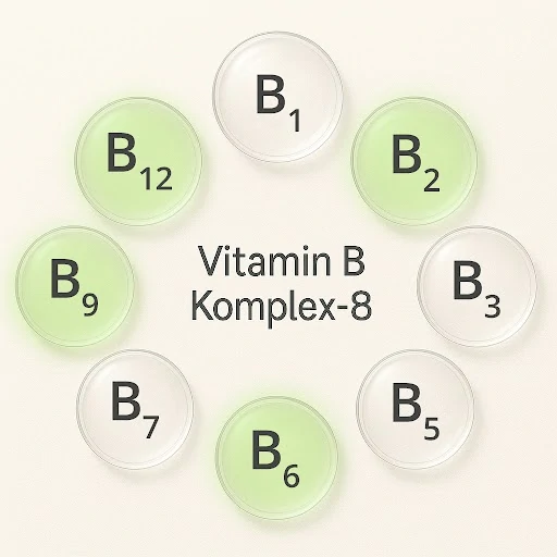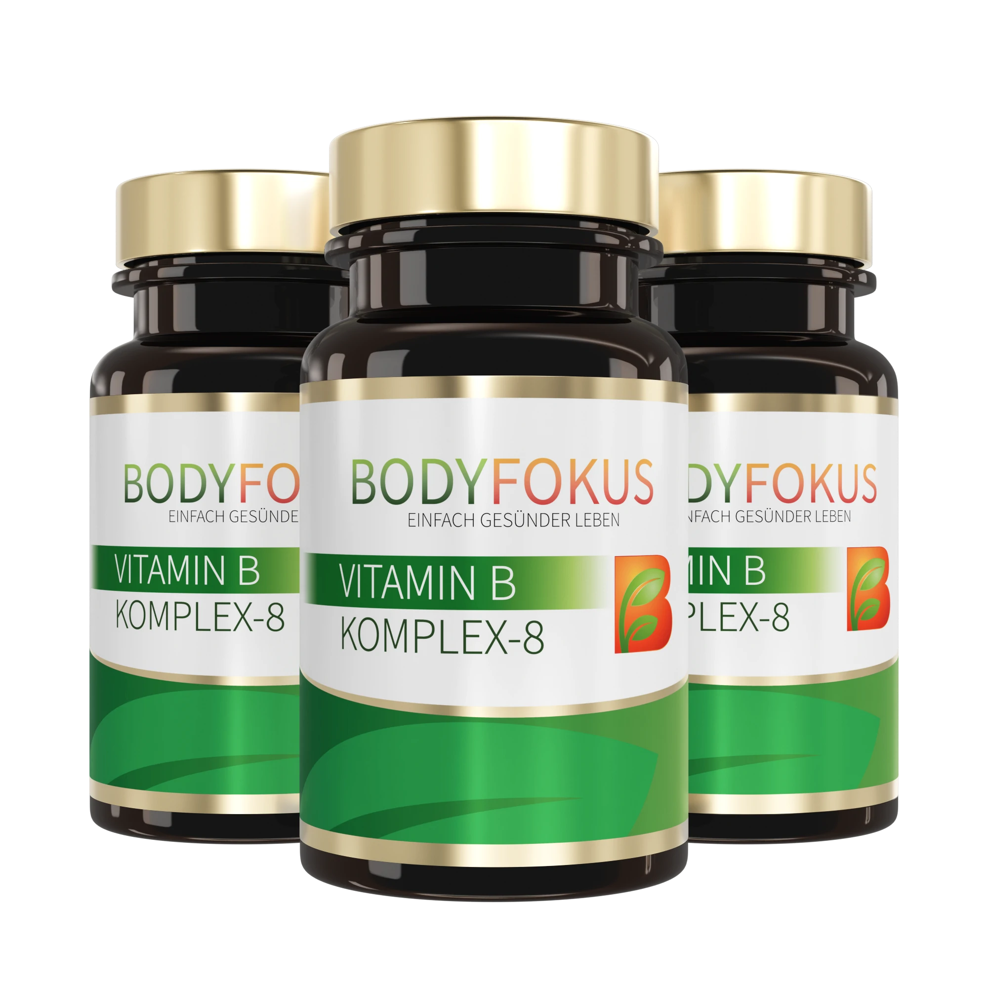 BodyFokus Vitamin B Komplex-8 enthält alle acht Vitamine des B-Komplexes in ausgewogener Dosierung: B1 (Thiamin), B2 (Riboflavin), B3 (Niacin), B5 (Pantothensäure), B6 (Pyridoxin), B7 (Biotin), B9 (Folsäure) und B12 (Cobalamin). Die Kombination bietet eine praktische Möglichkeit zur täglichen Ergänzung der Ernährung mit B-Vitaminen. B-Vitamine übernehmen vielfältige Funktionen im menschlichen Organismus, insbesondere im Energiestoffwechsel. So tragen beispielsweise Vitamin B2 und B12 zur Verringerung von Müdigkeit und Ermüdung bei. Vitamin B6 unterstützt die normale Funktion des Immun- und Nervensystems, während Pantothensäure zu einer normalen geistigen Leistung beiträgt und Folsäure eine Funktion bei der Zellteilung hat und zu einer normalen Blutbildung beiträgt.